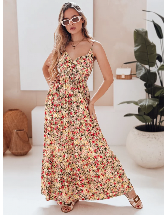 Długa sukienka na cienkich ramiączkach z bawełny, ozdobiona drobnym, kwiatowym printem i marszczeniem w talii, to idealny wybór na sezon wiosna-lato. Zapewnia swobodę ruchów, a lekki materiał świetnie sprawdza się w ciepłe dni. Styl romantyczny w nowoczesnym wydaniu.