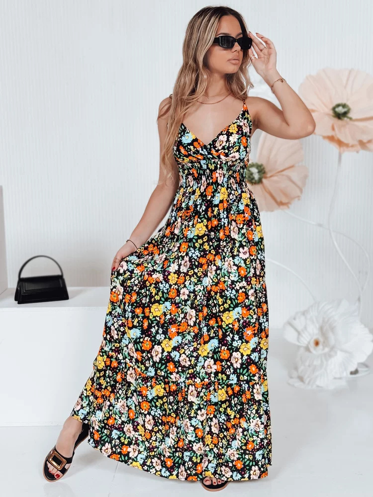 Bawełniana sukienka maxi na ramiączkach o zwiewnym kroju i soczystym, kwiatowym wzorze to idealna propozycja na słoneczne dni. Model z dekoltem kopertowym i elastycznym ściągaczem w pasie pięknie podkreśla sylwetkę, a długość maxi dodaje lekkości. Sprawdzi się w letnich stylizacjach na spacer, wakacje czy garden party.
