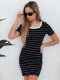 Prążkowana sukienka mini, która podkreśla figurę i zapewnia wygodę na co dzień. Miękki, rozciągliwy materiał dopasowuje się do sylwetki, a krótki rękaw oraz okrągły dekolt dodają klasycznego uroku. Subtelne paski dodają jej ponadczasowego stylu, idealnego zarówno na co dzień, jak i na luźniejsze spotkania. Sukienka idealna na wiosnę lub lato.