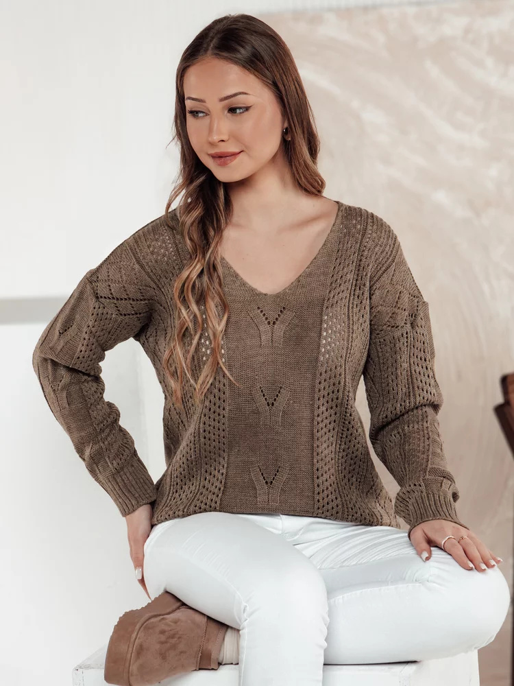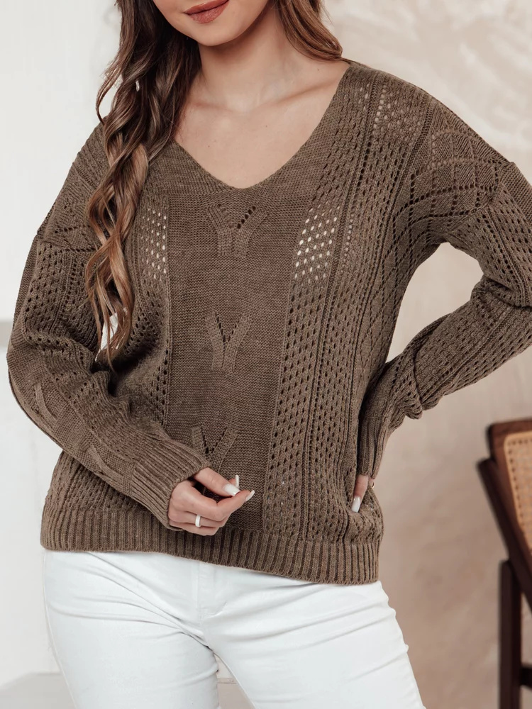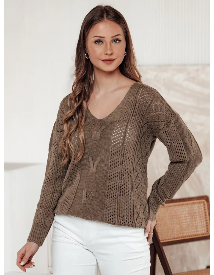 Ten stylowy sweter wyróżnia się pięknymi ażurowymi akcentami, które podkreślają jego delikatny charakter. Miękka tkanina gwarantuje komfort noszenia, a ponadczasowy design sprawdzi się w casualowych i bardziej eleganckich stylizacjach. Idealny na chłodniejsze dni.