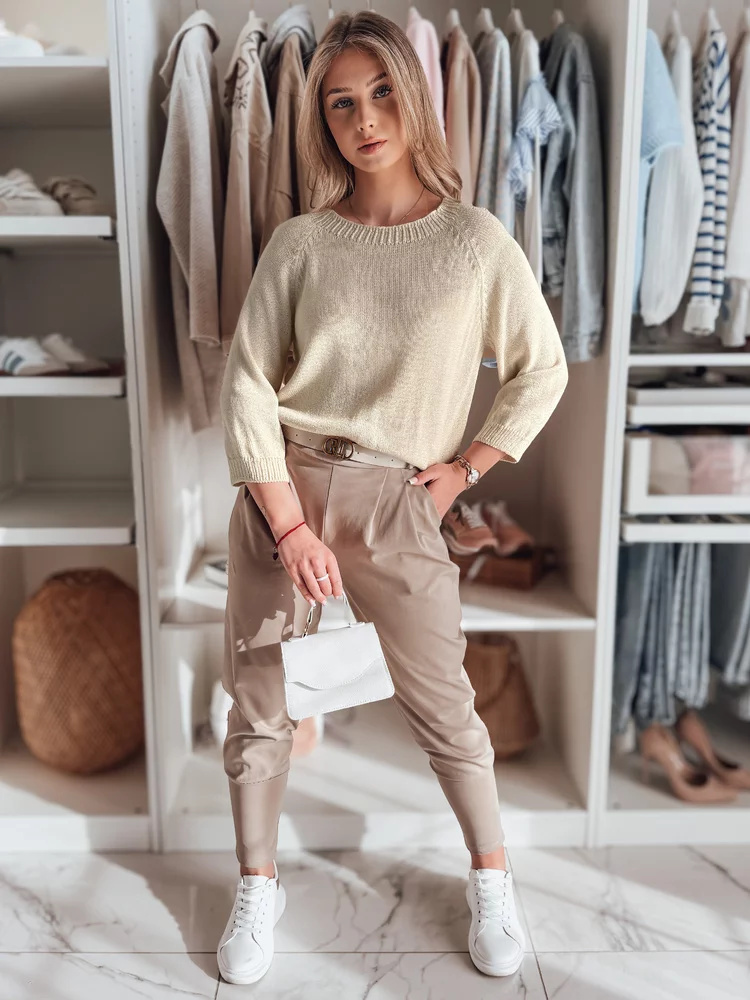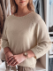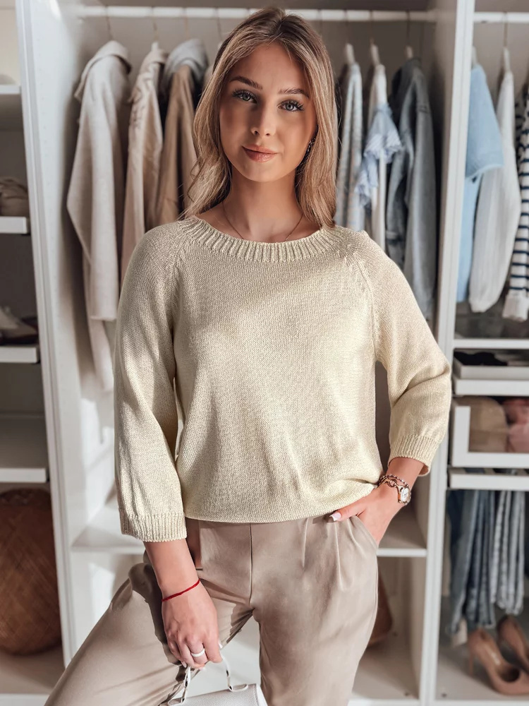 Damski sweter one size o luźnym, oversizowym kroju. Model z okrągłym dekoltem i rękawami 3/4 to doskonały wybór na co dzień. Ściągacze na dole i przy rękawach dbają o idealne dopasowanie. Klasyczny fason sprawia, że świetnie komponuje się zarówno z jeansami, jak i spódnicami. Idealny na cieplejsze dni.