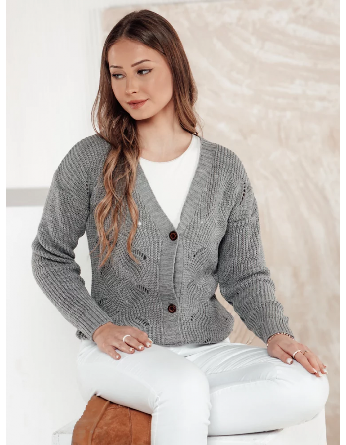 Rozpinany sweter damski z delikatnymi ażurowymi detalami to idealny wybór na chłodniejsze dni. Wykonany z miękkiej dzianiny zapewnia wygodę i styl. Klasyczne guziki dodają mu elegancji, a uniwersalny fason sprawia, że świetnie komponuje się zarówno z codziennymi, jak i bardziej formalnymi stylizacjami.