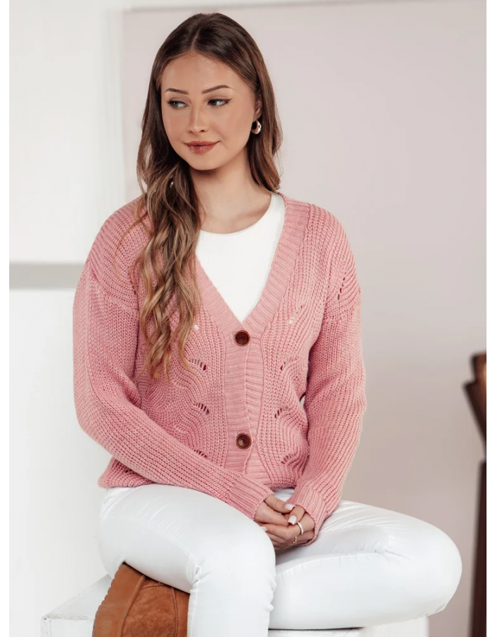Rozpinany sweter damski z delikatnymi ażurowymi detalami to idealny wybór na chłodniejsze dni. Wykonany z miękkiej dzianiny zapewnia wygodę i styl. Klasyczne guziki dodają mu elegancji, a uniwersalny fason sprawia, że świetnie komponuje się zarówno z codziennymi, jak i bardziej formalnymi stylizacjami.