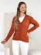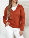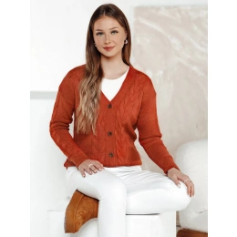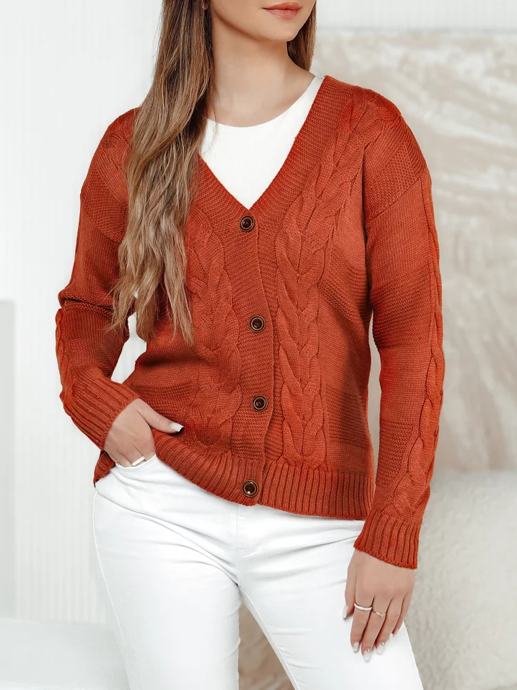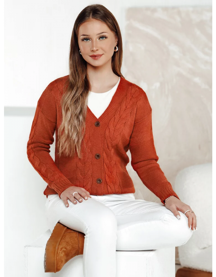 Stylowy sweter z głębokim dekoltem w kształcie litery V, zapinany na guziki. Wykonany z przyjemnego w dotyku materiału z efektownym wzorem warkoczy. Idealny do tworzenia różnorodnych stylizacji – zarówno na co dzień, jak i do pracy. Doskonały wybór dla miłośniczek wygody i ponadczasowej elegancji.