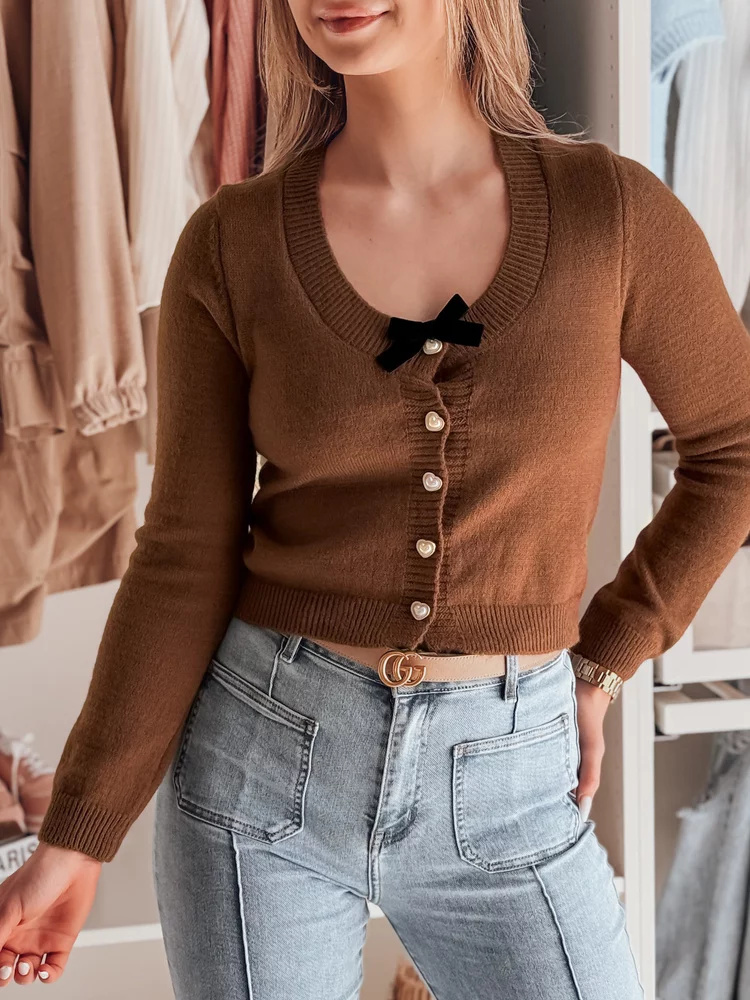 Sweter damskie krótki one size z kokardką LAMURE brązowy Dstreet MY2472 Uniwersalny
