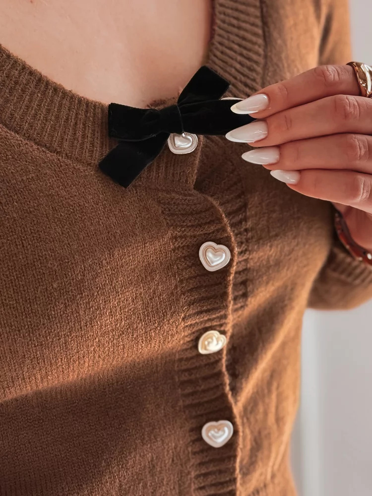 Krótki sweter o subtelnym, dziewczęcym designie, który łączy klasykę z urokiem romantycznych detali. Ozdobne guziki w kształcie serc dodają mu delikatności, a aksamitna kokardka podkreśla elegancki charakter. Uniwersalny rozmiar pasuje od XS do L. Ściągacze przy rękawach i na dole gwarantują idealne dopasowanie. Wykonany z miękkiego, ciepłego materiału, który sprawdzi się zarówno na chłodniejsze dni, jak i do lekkich stylizacji. To propozycja dla kobiet, które cenią sobie wygodę i dziewczęcość.