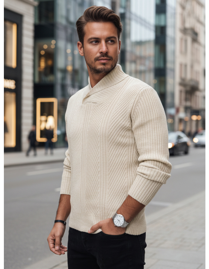 Sweter z kołnierzem szalowym idealny na chłodniejsze dni, wyróżniający się eleganckim splotem. Wykonany z wysokiej jakości materiału, który zapewnia wygodę i komfort noszenia przez cały dzień. Dzięki uniwersalnemu fasonowi, doskonale pasuje zarówno do casualowych, jak i bardziej eleganckich stylizacji. Idealny wybór dla mężczyzn ceniących klasyczny styl z nowoczesnym akcentem.