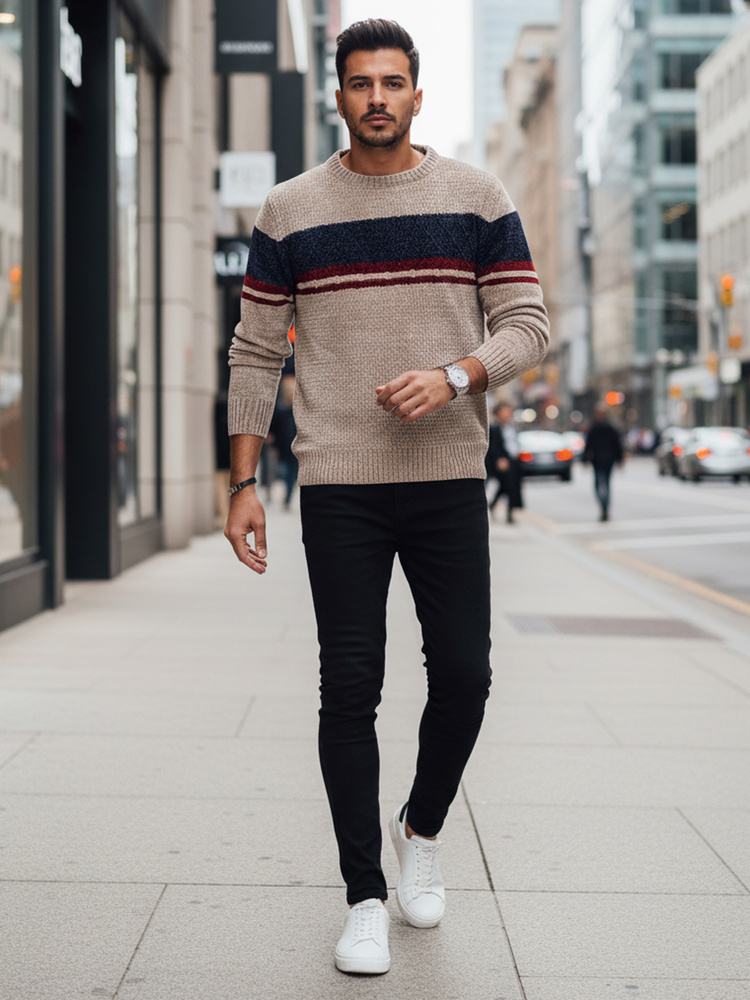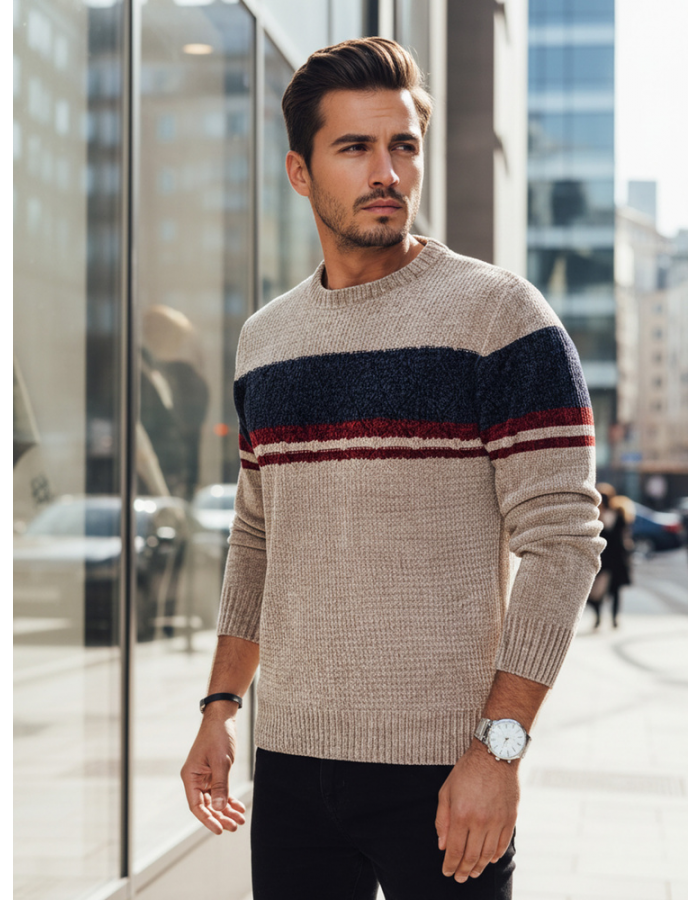 Ten sweter to idealne połączenie stylu i komfortu. Dzięki szerokim paskom na klatce piersiowej i rękawach, świetnie wyróżnia się w każdej stylizacji. Wykonany z miękkiej i ciepłej tkaniny, która zapewnia wygodę przez cały dzień. Doskonały wybór na chłodniejsze dni, gdy chce się wyglądać modnie i czuć się komfortowo.