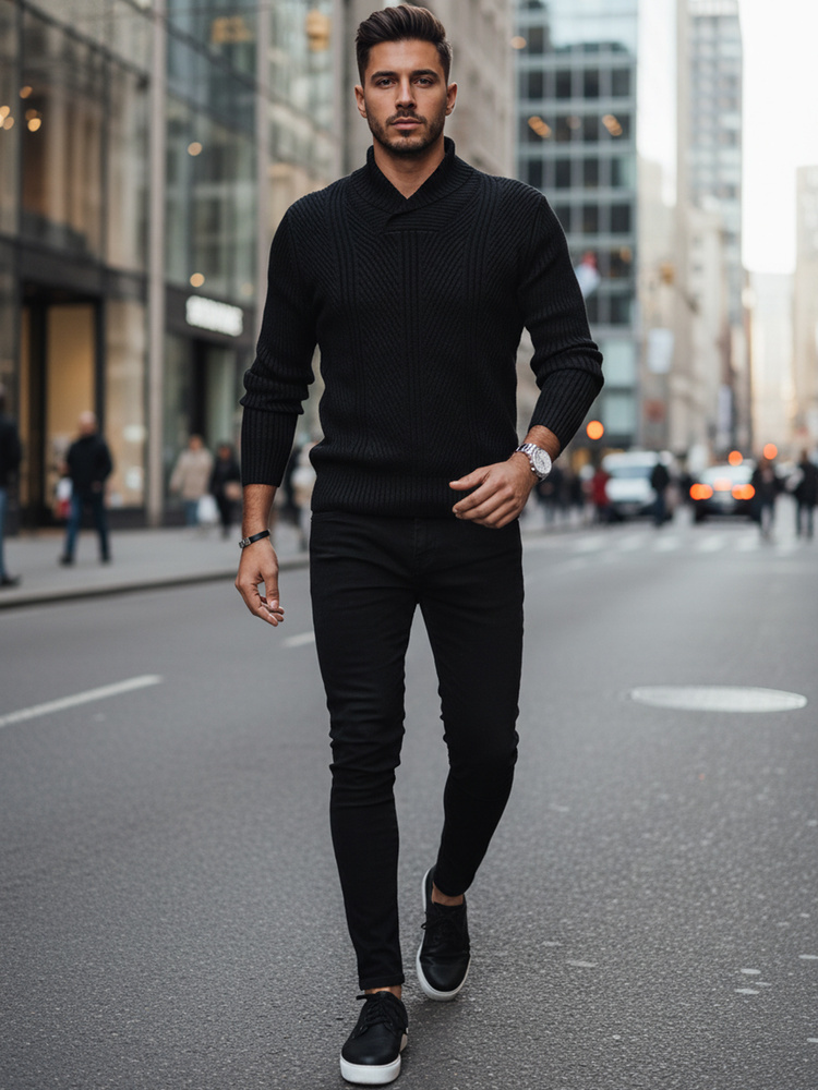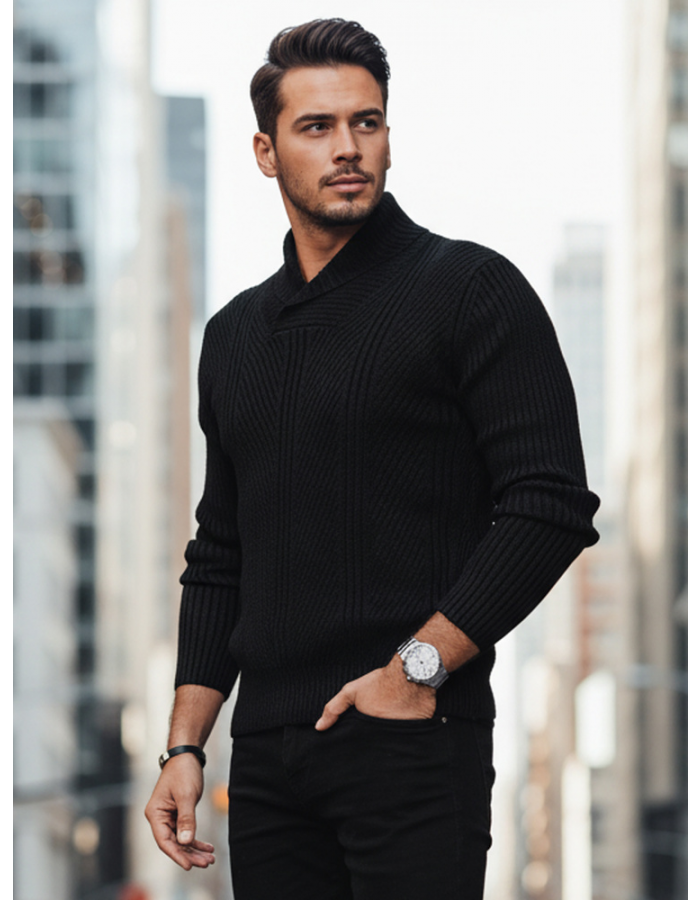 Sweter z kołnierzem szalowym idealny na chłodniejsze dni, wyróżniający się eleganckim splotem. Wykonany z wysokiej jakości materiału, który zapewnia wygodę i komfort noszenia przez cały dzień. Dzięki uniwersalnemu fasonowi, doskonale pasuje zarówno do casualowych, jak i bardziej eleganckich stylizacji. Idealny wybór dla mężczyzn ceniących klasyczny styl z nowoczesnym akcentem.