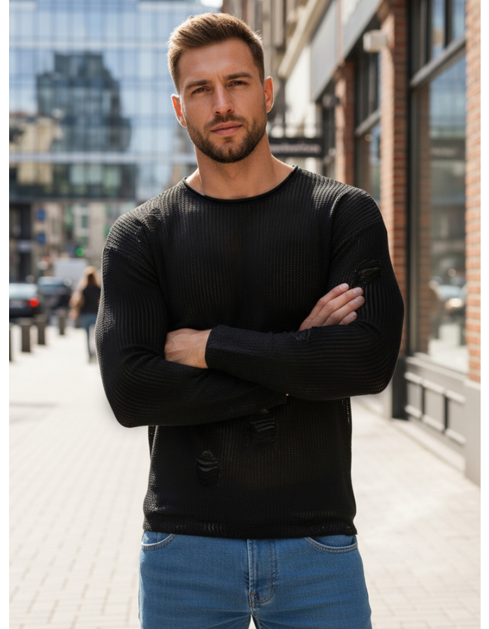 Oryginalny sweter męski z subtelnymi przetarciami, które nadają mu wyrazisty charakter. Wykonany z miękkiej dzianiny, doskonale sprawdzi się w casualowych stylizacjach. To doskonały wybór na co dzień, gdy chcesz połączyć wygodę z modnym wyglądem.