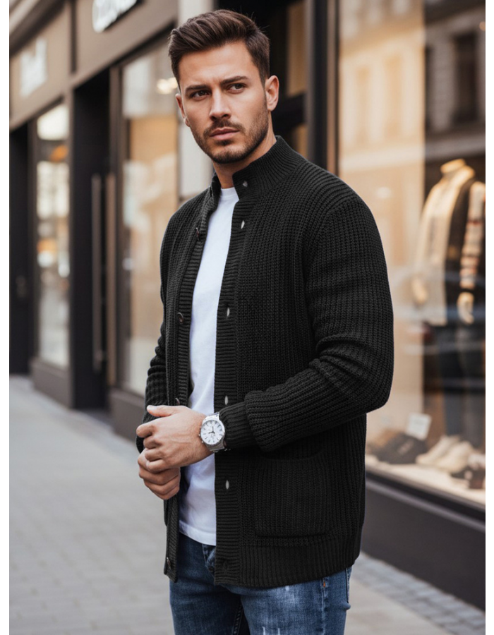 Gruba i wyrazista dzianina poprawia komfort cieplny, a klasyczny fason kardiganu czyni go odpowiednim zarówno do stylizacji casualowych, jak i bardziej uporządkowanych zestawów. Zapięcie na guziki umożliwia szybkie dopasowanie stopnia przewiewności, a czarny kolor ułatwia łączenie swetra z różnymi elementami garderoby.