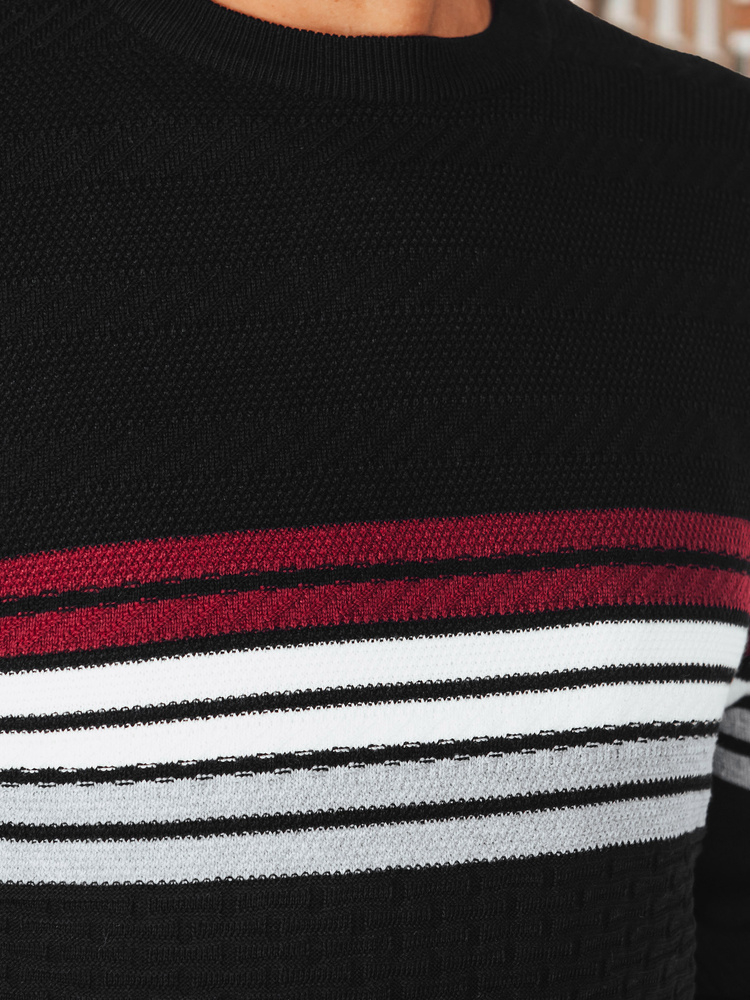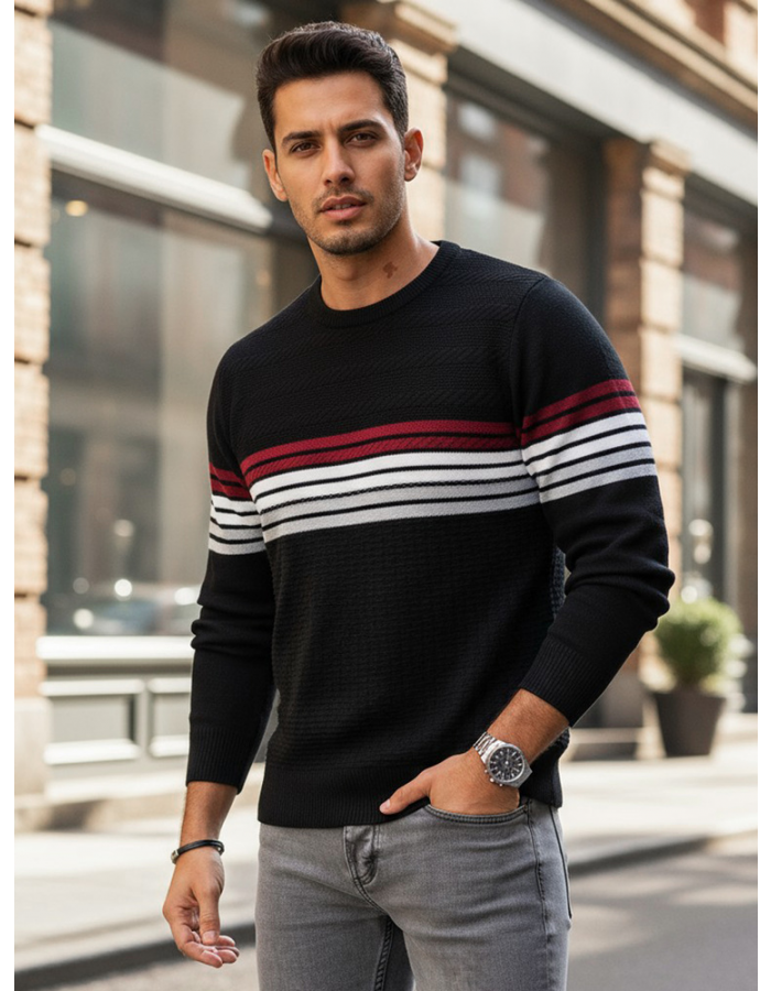 Stylowy męski sweter z poziomymi pasami to połączenie klasyki i nowoczesności. Wykonany z miękkiej dzianiny o wysokiej zawartości wełny, gwarantuje komfort cieplny i wygodę noszenia. Subtelna faktura materiału oraz kontrastowe paski na piersi nadają mu wyrazisty, miejski charakter.