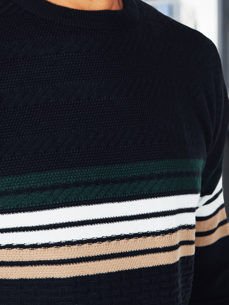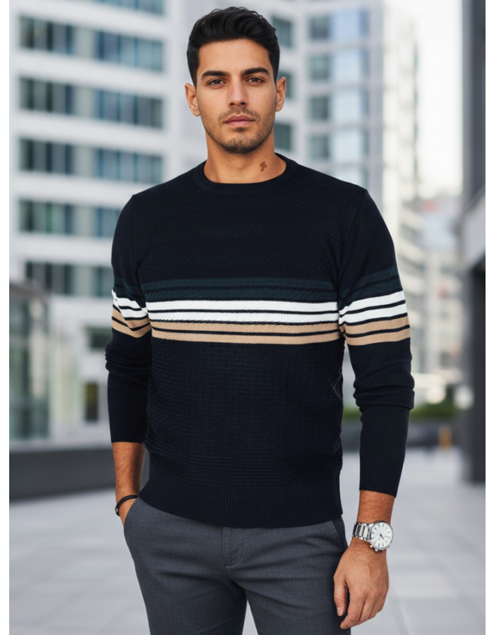 Stylowy męski sweter z poziomymi pasami to połączenie klasyki i nowoczesności. Wykonany z miękkiej dzianiny o wysokiej zawartości wełny, gwarantuje komfort cieplny i wygodę noszenia. Subtelna faktura materiału oraz kontrastowe paski na piersi nadają mu wyrazisty, miejski charakter.