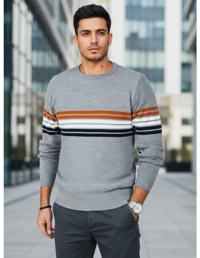Stylowy męski sweter z poziomymi pasami to połączenie klasyki i nowoczesności. Wykonany z miękkiej dzianiny o wysokiej zawartości wełny, gwarantuje komfort cieplny i wygodę noszenia. Subtelna faktura materiału oraz kontrastowe paski na piersi nadają mu wyrazisty, miejski charakter.