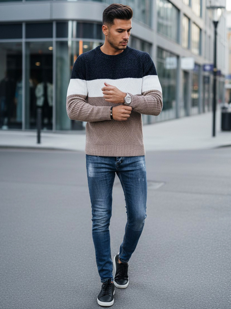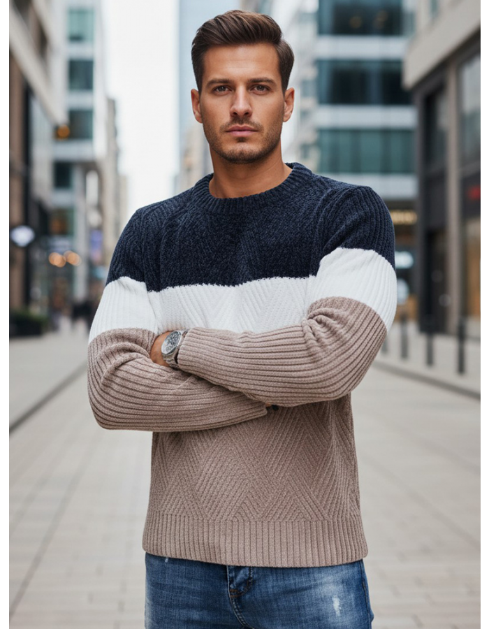 Sweter męski o klasycznym kroju z okrągłym dekoltem to połączenie wygody i ponadczasowego stylu. Wykonany z miękkiej, przyjemnej w dotyku dzianiny, zapewnia komfort cieplny w chłodniejsze dni. Trójkolorowa kompozycja dodaje mu nowoczesnego charakteru i sprawia, że pasuje do wielu casualowych stylizacji.