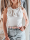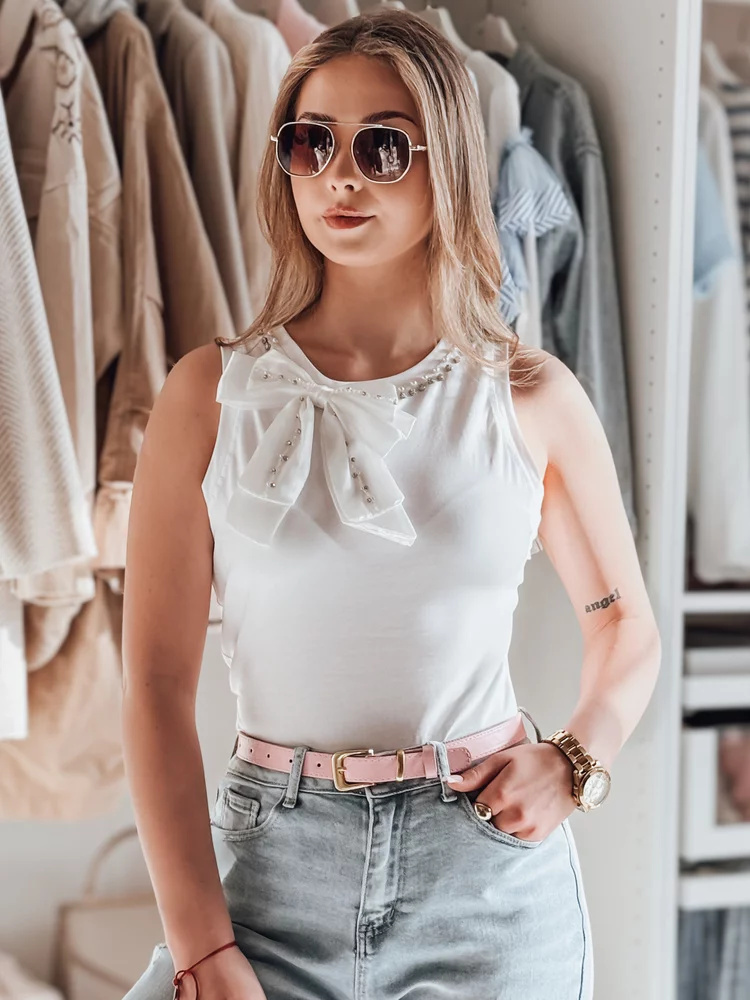 Elegancki t-shirt na ramiączkach z efektowną, dużą kokardą, która dodaje szyku każdej stylizacji. Dekolt ozdobiony subtelnymi perełkami i błyszczącymi cyrkoniami, które nadają mu wyjątkowego charakteru. Wykonany z miękkiego i elastycznego materiału, idealnie dopasowuje się do sylwetki, zapewniając komfort noszenia na co dzień oraz w wyjątkowych okazjach.