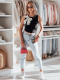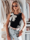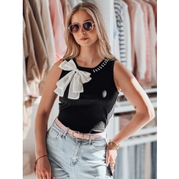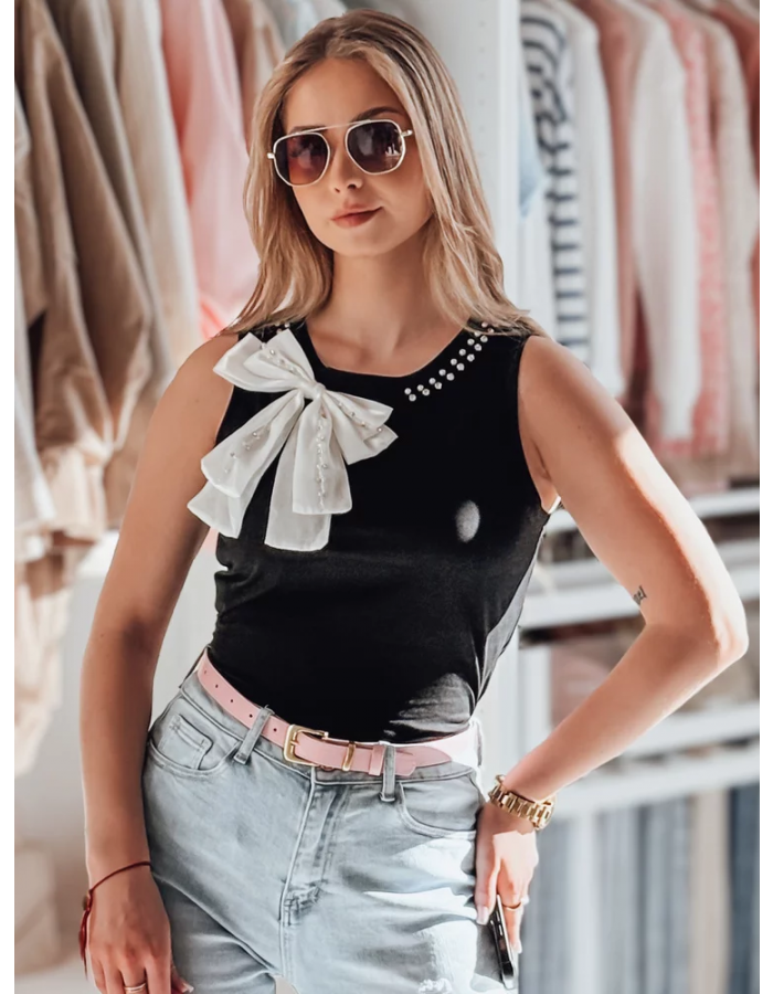 Elegancki t-shirt na ramiączkach z efektowną, dużą kokardą, która dodaje szyku każdej stylizacji. Dekolt ozdobiony subtelnymi perełkami i błyszczącymi cyrkoniami, które nadają mu wyjątkowego charakteru. Wykonany z miękkiego i elastycznego materiału, idealnie dopasowuje się do sylwetki, zapewniając komfort noszenia na co dzień oraz w wyjątkowych okazjach.