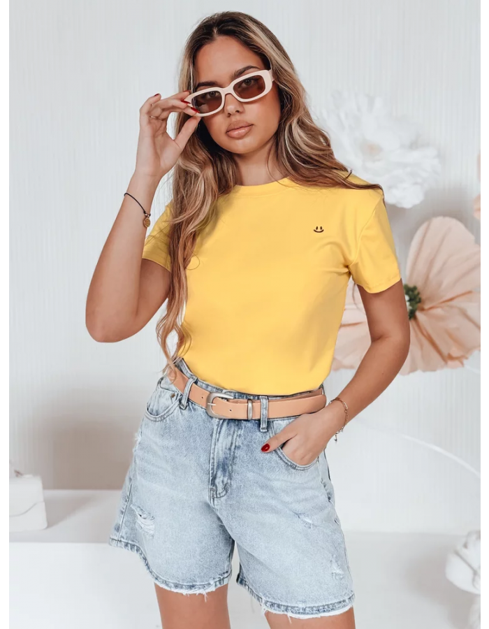 T-shirt damski z prążkowanej tkaniny to świetna propozycja na cieplejsze dni. Krótki rękaw i okrągły dekolt sprawiają, że model zapewnia pełną swobodę ruchu oraz wygodę na co dzień. Mały haftowany detal w postaci uśmiechu na piersi dodaje mu lekkości, jak i humoru. Uniwersalny rozmiar pasuje od XS do L. Idealny wybór na wiosenne lub letnie dni.