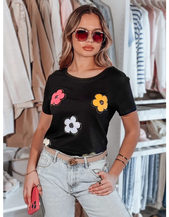 Delikatny t-shirt damski, który wyróżnia się uroczym nadrukiem kwiatowym z efektem 3D. Cyrkonie umieszczone wokół wzoru dodają subtelnego blasku, tworząc niezwykle kobiecy efekt. Klasyczny fason z krótkim rękawem i okrągłym dekoltem sprawia, że jest to doskonały wybór na co dzień i do casualowych stylizacji.