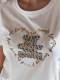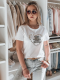 T-shirt damski o luźnym kroju, idealny do codziennych stylizacji. Ozdobiony stylowym nadrukiem misia oraz złotymi napisami, które nadają mu wyjątkowego charakteru. Wygodny fason zapewnia swobodę ruchów, a klasyczny krój świetnie komponuje się z jeansami lub spódnicą. Doskonały wybór na co dzień i na luźne spotkania.