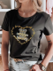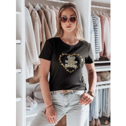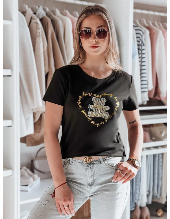 T-shirt damski o luźnym kroju, idealny do codziennych stylizacji. Ozdobiony stylowym nadrukiem misia oraz złotymi napisami, które nadają mu wyjątkowego charakteru. Wygodny fason zapewnia swobodę ruchów, a klasyczny krój świetnie komponuje się z jeansami lub spódnicą. Doskonały wybór na co dzień i na luźne spotkania.