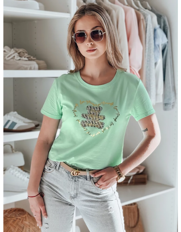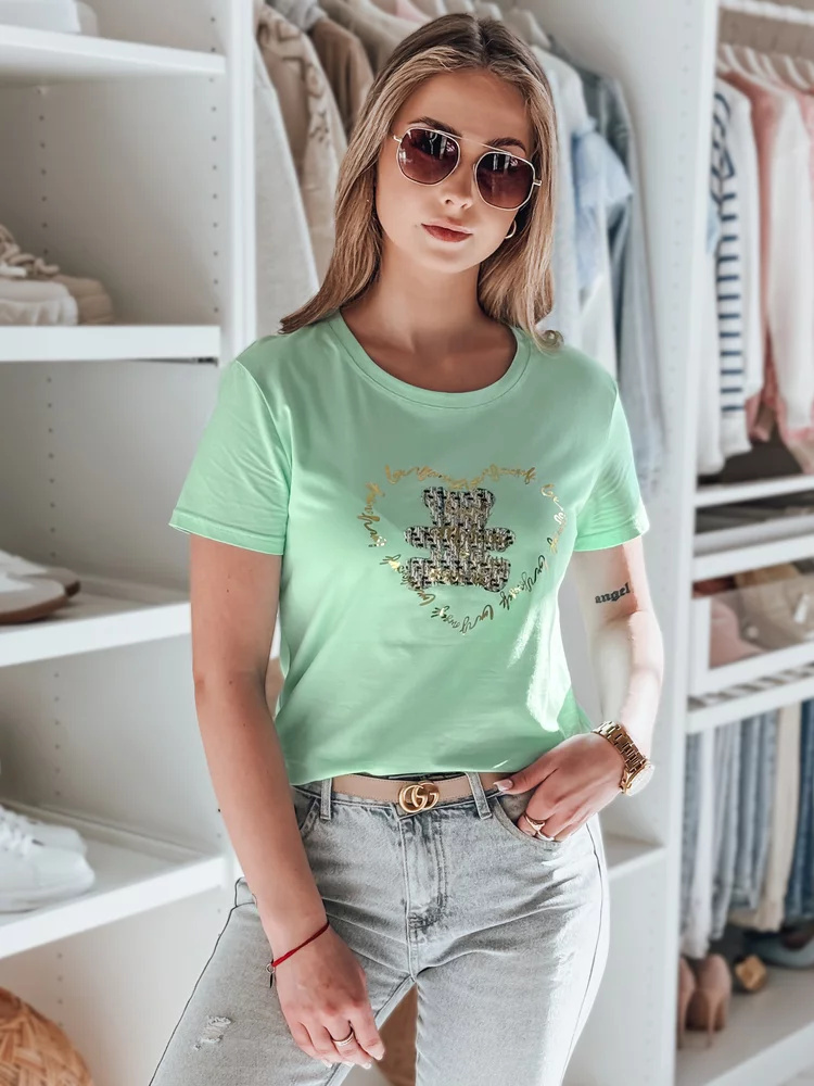 T-shirt damski o luźnym kroju, idealny do codziennych stylizacji. Ozdobiony stylowym nadrukiem misia oraz złotymi napisami, które nadają mu wyjątkowego charakteru. Wygodny fason zapewnia swobodę ruchów, a klasyczny krój świetnie komponuje się z jeansami lub spódnicą. Doskonały wybór na co dzień i na luźne spotkania.