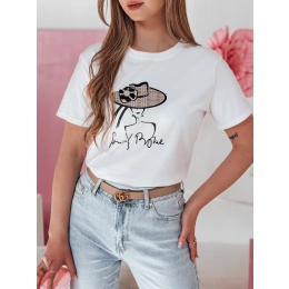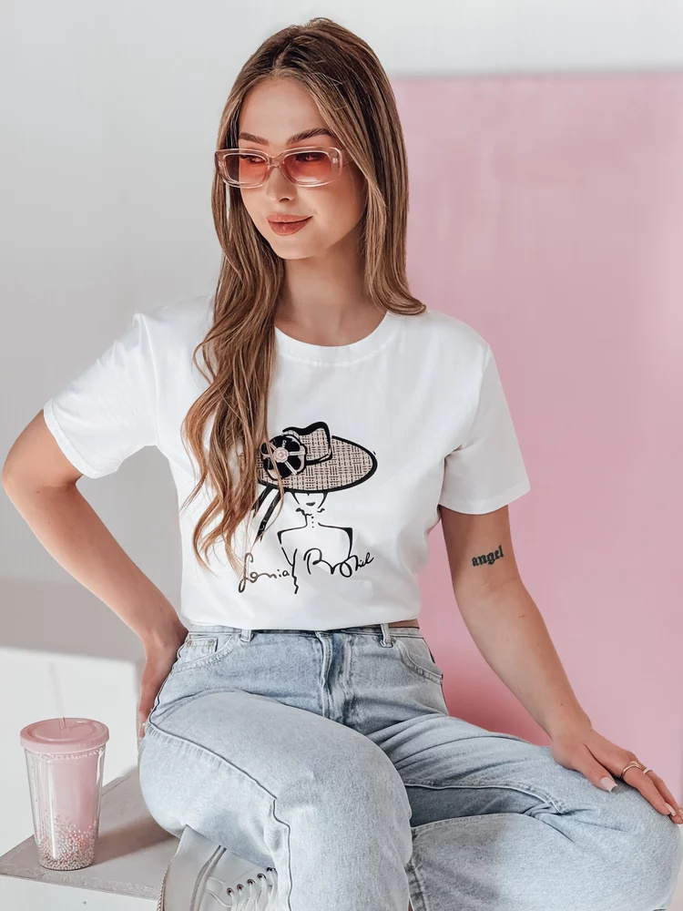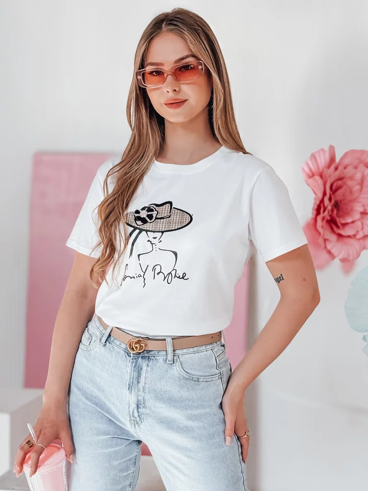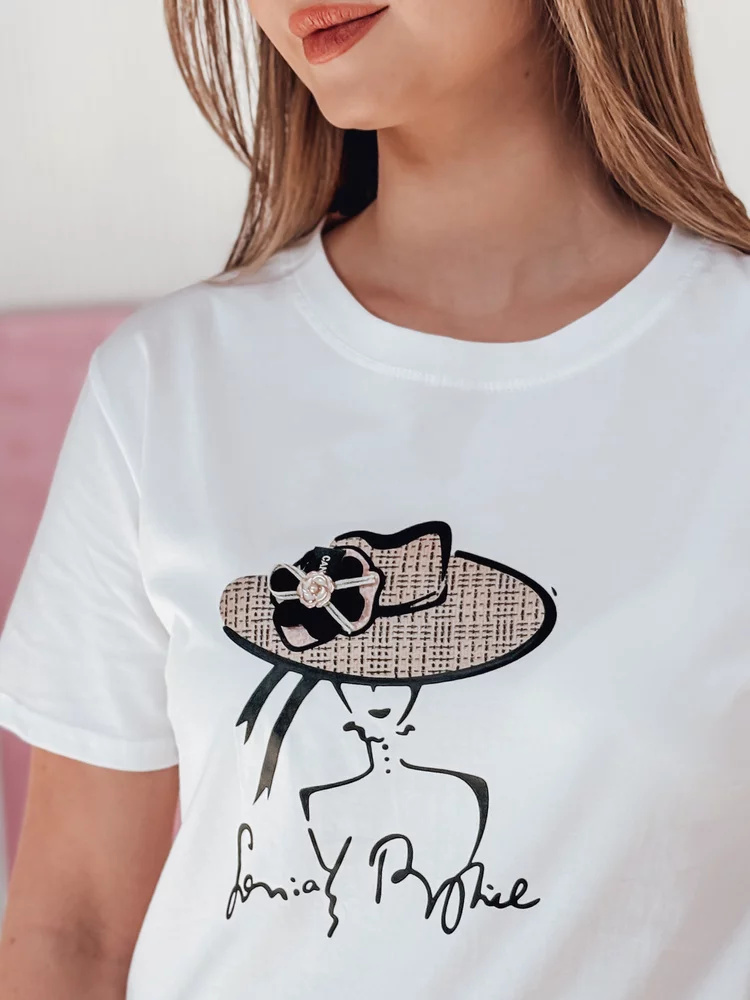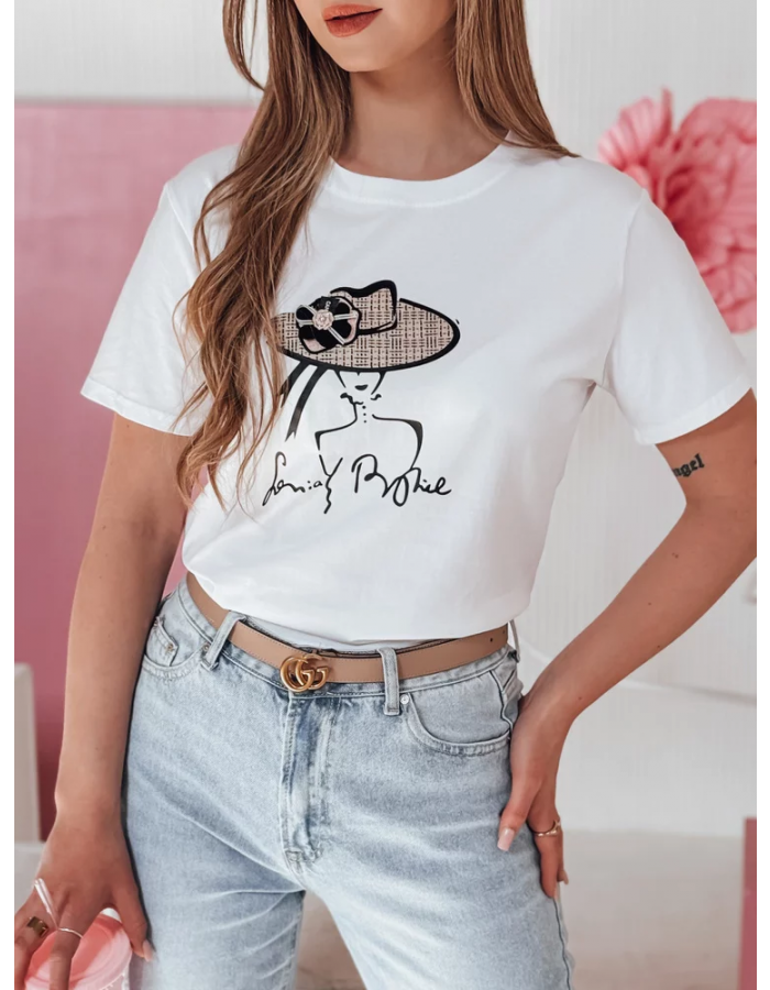 Stylowy t-shirt damski o swobodnym kroju z dekoracyjnym nadrukiem kobiety w kapeluszu. Naszyty kwiat na kapeluszu przyciąga wzrok i nadaje koszulce wyjątkowego wyrazu oraz efektu 3D. Klasyczny fason pasuje zarówno do codziennych stylizacji, jak i bardziej eleganckich zestawów.