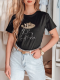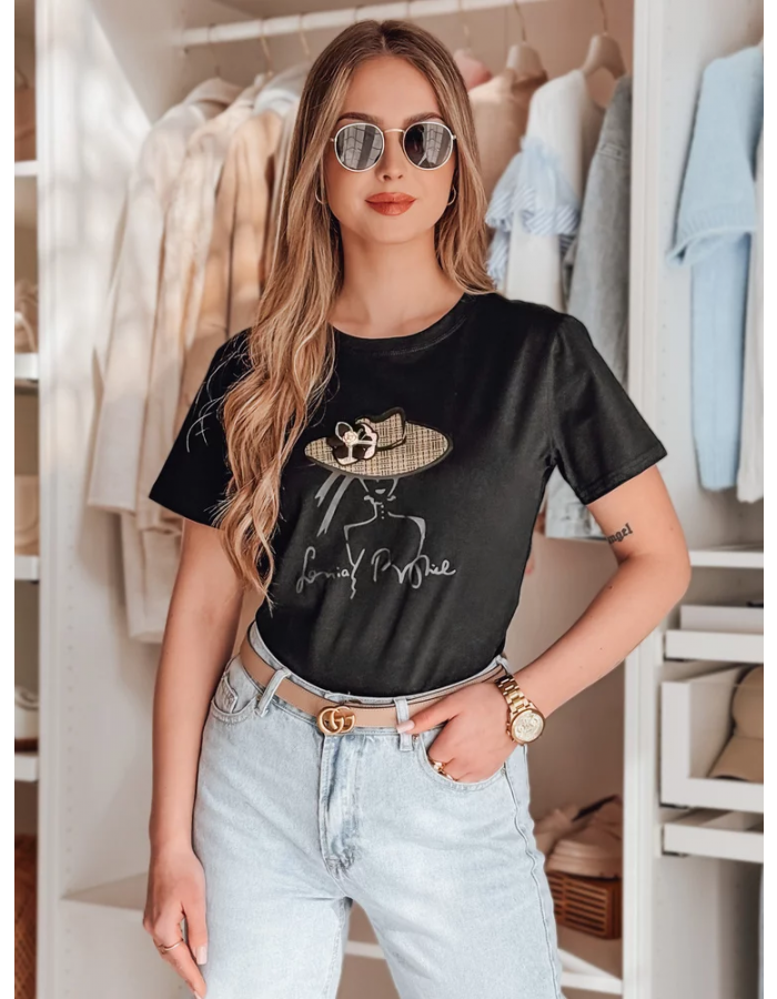 Stylowy t-shirt damski o swobodnym kroju z dekoracyjnym nadrukiem kobiety w kapeluszu. Naszyty kwiat na kapeluszu przyciąga wzrok i nadaje koszulce wyjątkowego wyrazu oraz efektu 3D. Klasyczny fason pasuje zarówno do codziennych stylizacji, jak i bardziej eleganckich zestawów.