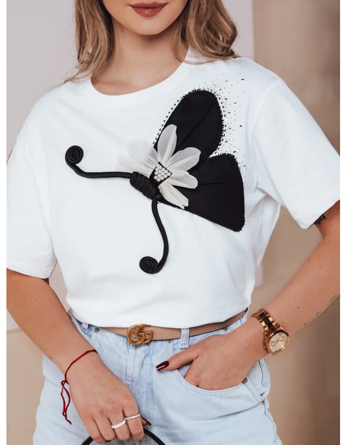 Ten wyjątkowy t-shirt z efektownym zdobieniem 3D w formie kwiatowego motyla łączy wygodę z unikalnym stylem. Delikatne detale, takie jak aplikacje i subtelne perełki, nadają mu elegancji i wyróżniają go na tle innych modeli. Idealny wybór na co dzień i na spotkania w swobodnym stylu.