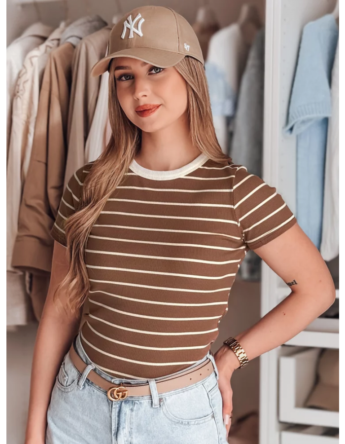 T-shirt damski basic w paski LINESS ry2810 brązowy
