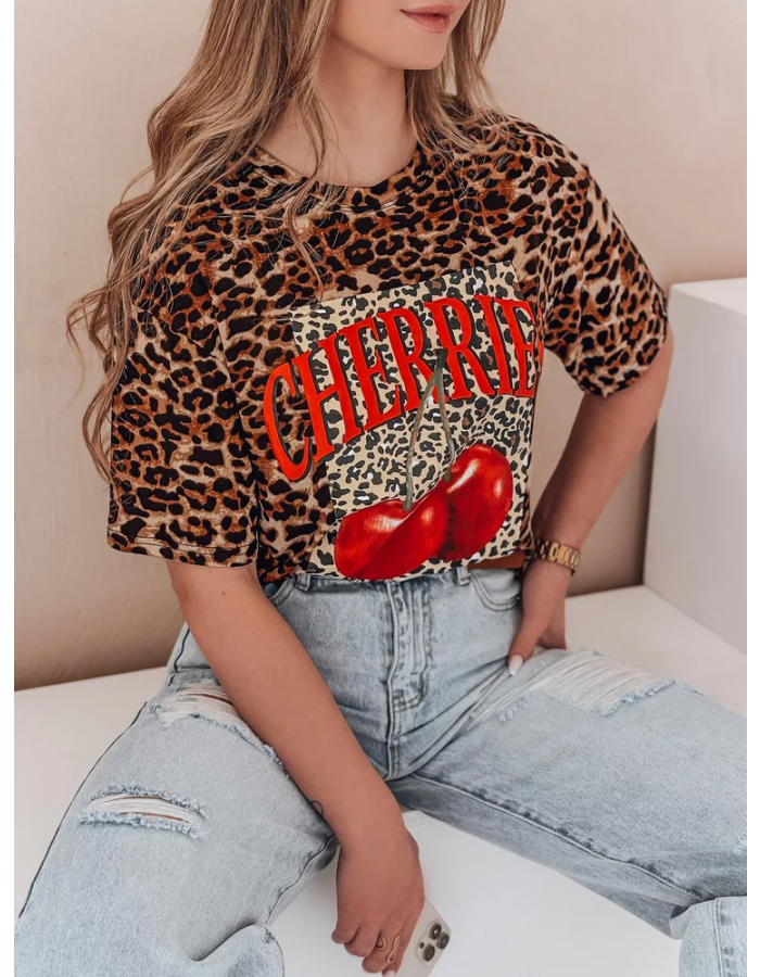 T-shirt damski oversize o wyrazistym charakterze dzięki motywowi panterki, który pokrywa całą powierzchnię materiału. Na froncie efektowny nadruk przedstawiający czerwone wiśnie i duży napis "CHERRIES", które przyciągają wzrok, jak i nadają stylizacji energii. Model posiada okrągły dekolt oraz krótkie rękawy, co czyni go idealnym wyborem na wiosenne i letnie dni. Doskonale łączy się z jeansami lub szortami, tworząc modny, casualowy look z pazurem.