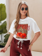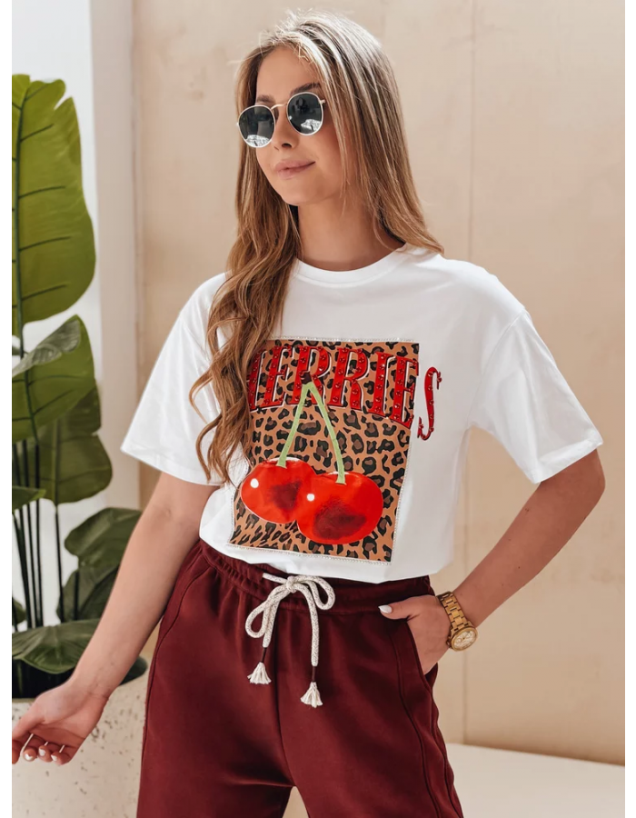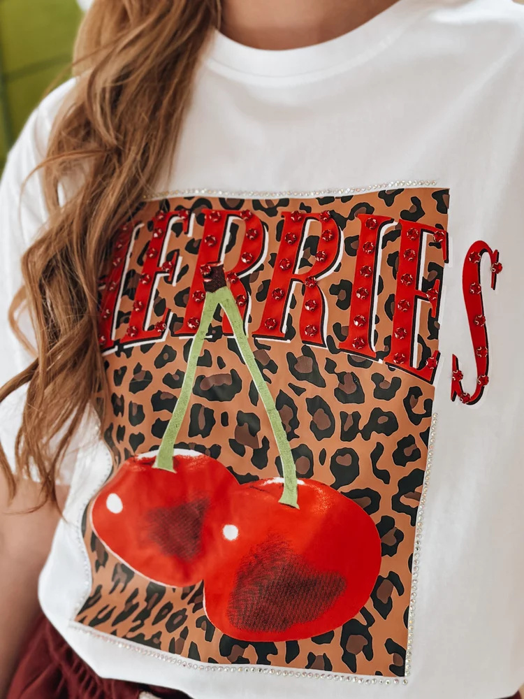 Wygodny t-shirt damski z charakterystycznym nadrukiem dwóch czerwonych wiśni osadzonych na tle z panterkowym printem. Model przyciąga uwagę dużym, ozdobnym napisem z mieniącymi się cyrkoniami oraz subtelnym błyskiem dookoła nadruku nadając koszulce efektu 3D. Luźny krój typu oversize z krótkim rękawem, jak i klasycznym dekoltem świetnie sprawdza się w casualowych stylizacjach.
