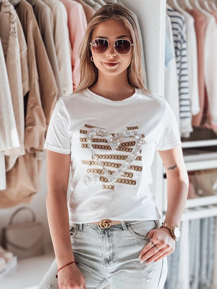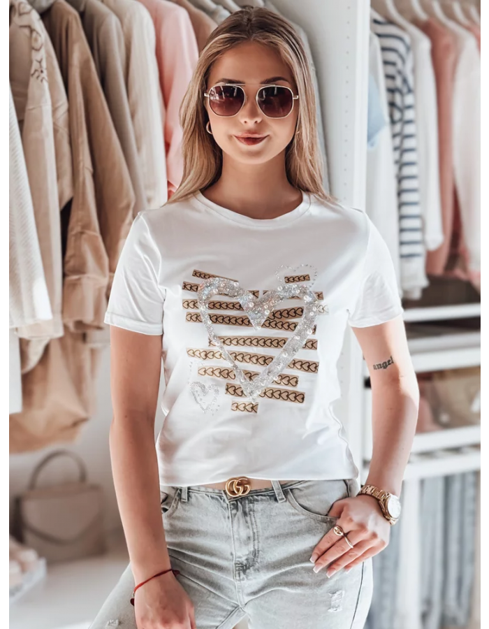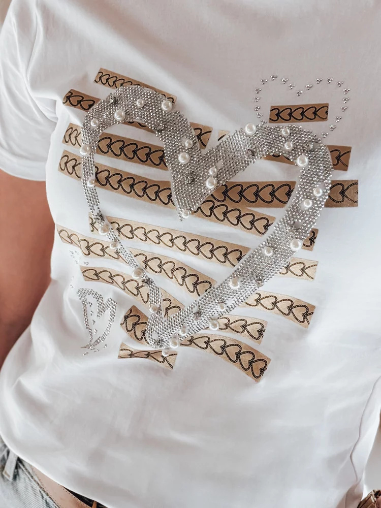 T-shirt damski z krótkim rękawem, ozdobiony efektownym nadrukiem w kształcie serca. Wzór został wzbogacony o błyszczące cyrkonie i perły, które nadają całości wyjątkowego charakteru oraz efektu 3D. Dekoracyjne przeszycia i delikatny połysk sprawiają, że ten model doskonale łączy elegancję ze swobodnym stylem. Idealna baza do codziennych i bardziej wyrazistych stylizacji.