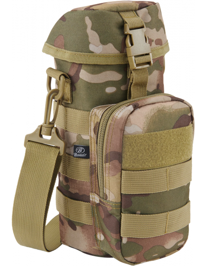 V praxi testovaný držák na láhev je vyroben s víkem a klipsovým uzávěrem, stejně jako s další vnější přihrádkou na zip a vnitřní síťovanou kapsou. Nastavitelný ramenní popruh držáku na láhev lze připnout na dva D-kroužky. Pevné povrchy na suchý zip umožňují připevnění dalších záplat a rozšíření upevňovacích smyček PALS pomocí systémů Molle. Funkce jsou zakončeny háček pro rychlé uvolnění klipu na zadní straně. Funkčně řešený držák na lahve je vyroben pro lahve o průměru do 9 cm s objemem od půl do jednoho litru. Decentní štítek s logem Brandit na boku doplňuje vojenský styl.