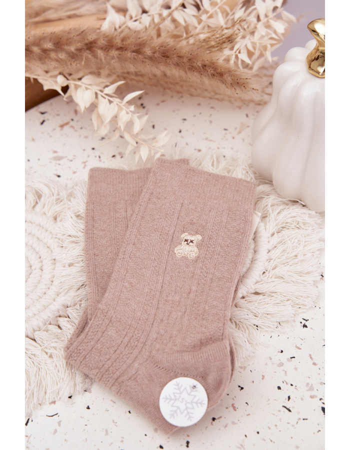 Hřejivé dámské ponožky v jemně béžovém odstínu s roztomilým motivem medvídka. Vyrobené z měkké vlněné směsi, která poskytuje teplo, měkkost a komfort při nošení. Ideální volba pro zimní období a domácí pohodu.