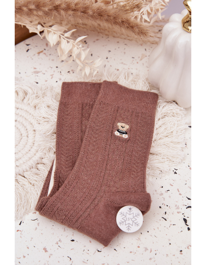 Hřejivé dámské ponožky v hnědém odstínu s roztomilým motivem medvídka. Vyrobené z měkké vlněné směsi, která poskytuje tepelný komfort, měkkost a pohodlí při nošení. Ideální volba pro zimní období a domácí pohodu.