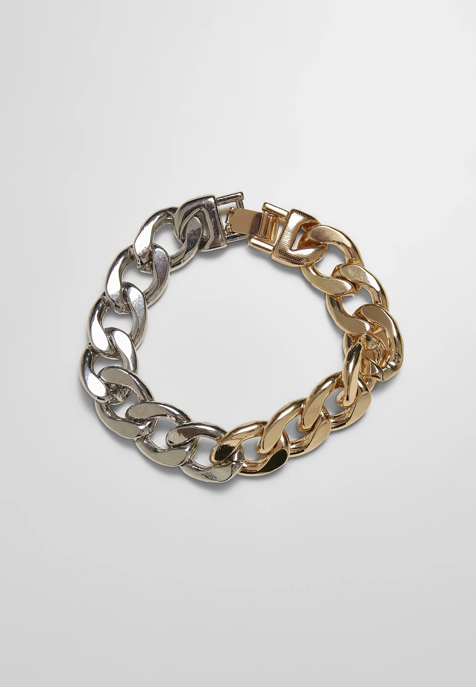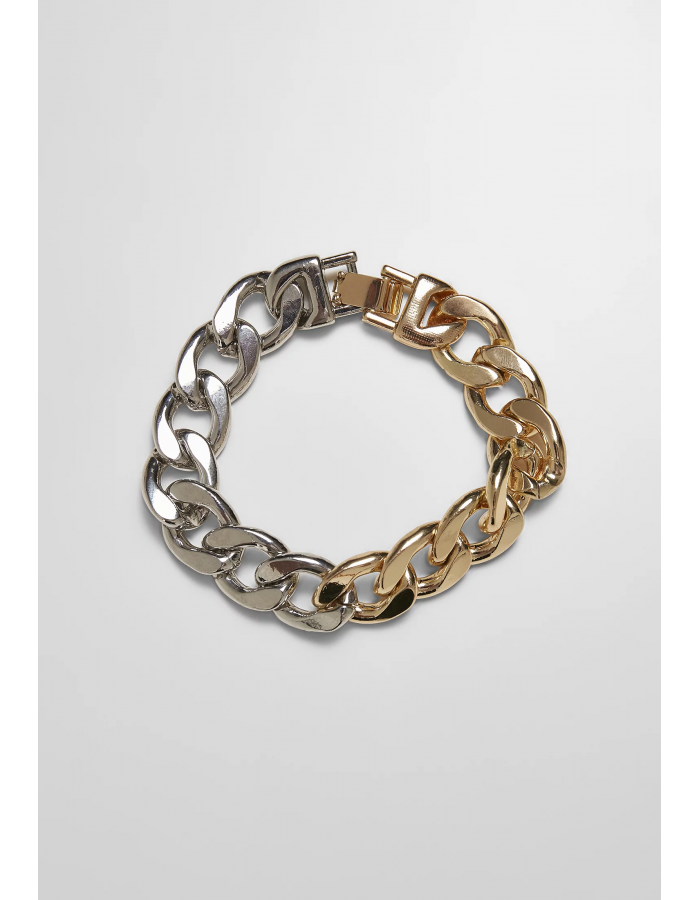 Tento těžký náramek kombinuje dominantní vzhled velkých článků řetězu s propracovaným dvoubarevným designem. Zapíná se na pružnou sponu a měří 21 centimetrů. Pevný šperk Urban Classics je vyroben ze slitiny zinku.