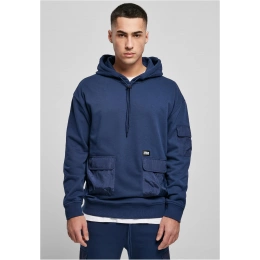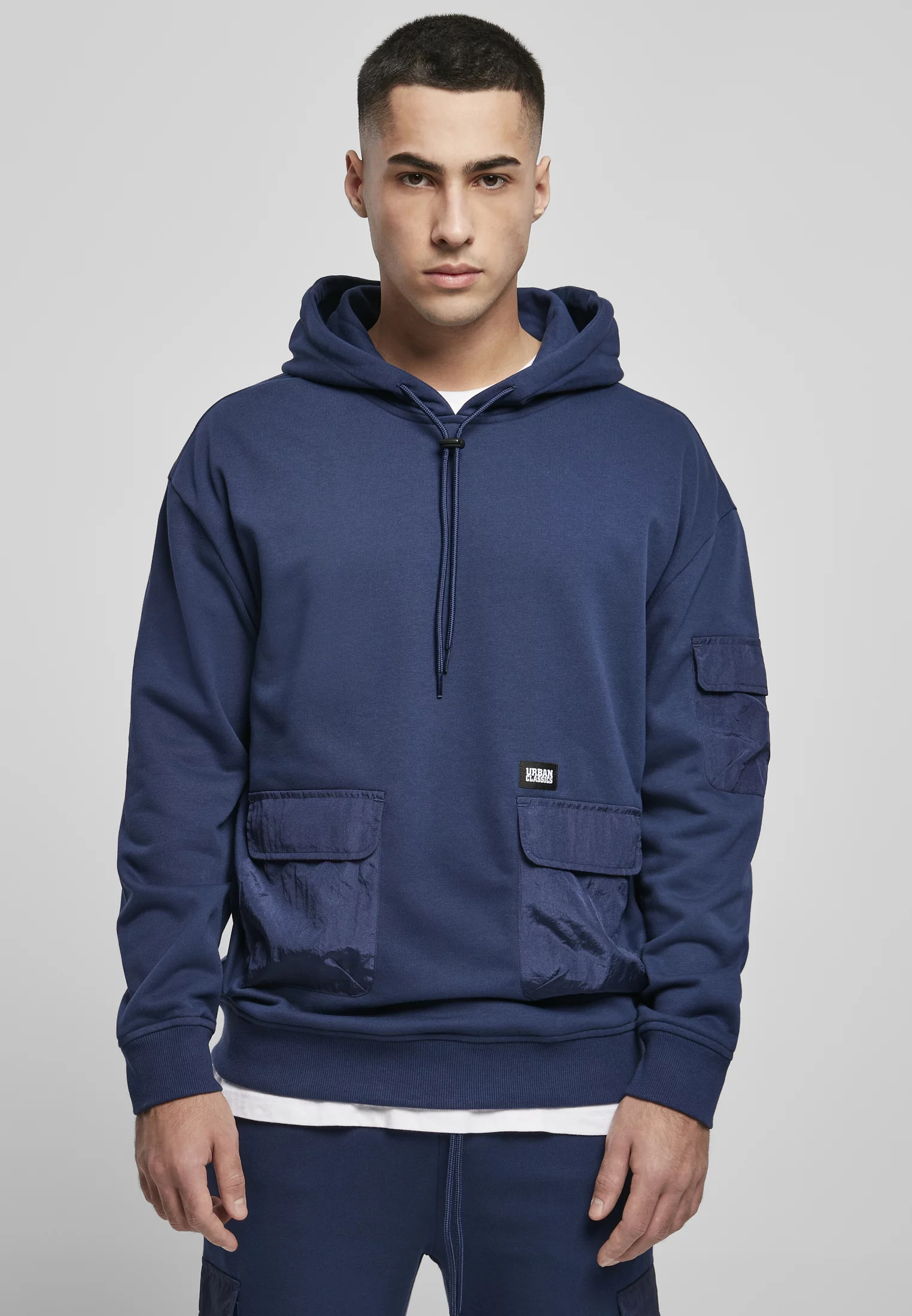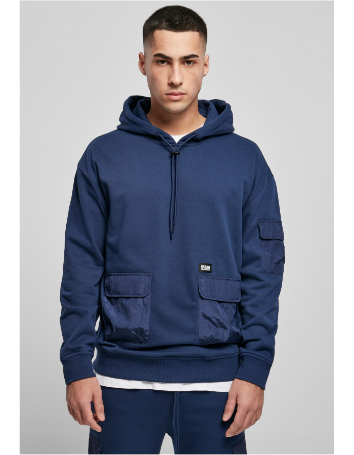 Tato propracovaná pánská mikina je variantou vyhlášeného mikiny s kapucí. Kromě obligátní kapuce se stahovacími šňůrkami a zarážkou má tato mikina tři kapsy s klopami z kontrastního nylonu – dvě břišní kapsy s jednou nášivkou s logem Urban Classics nad levou kapsou a další kapsu na levém rukávu. Trendový styl završují široké žebrované manžety na rukávech a spodním lemu. Svetr má pravidelný střih a je vyroben z měkké froté látky.