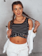 Dopasowany top o krótkim fasonie to coś co nada każdej stylizacji niepowtarzalnego wyglądu. Model w paski oraz dół zakończony skrzyżowanymi gumkami tworzą piękną całość. Wykonany został z wysokiej jakości, prążkowanego materiału, dzięki czemu idealnie dopasowuje się do sylwetki.