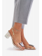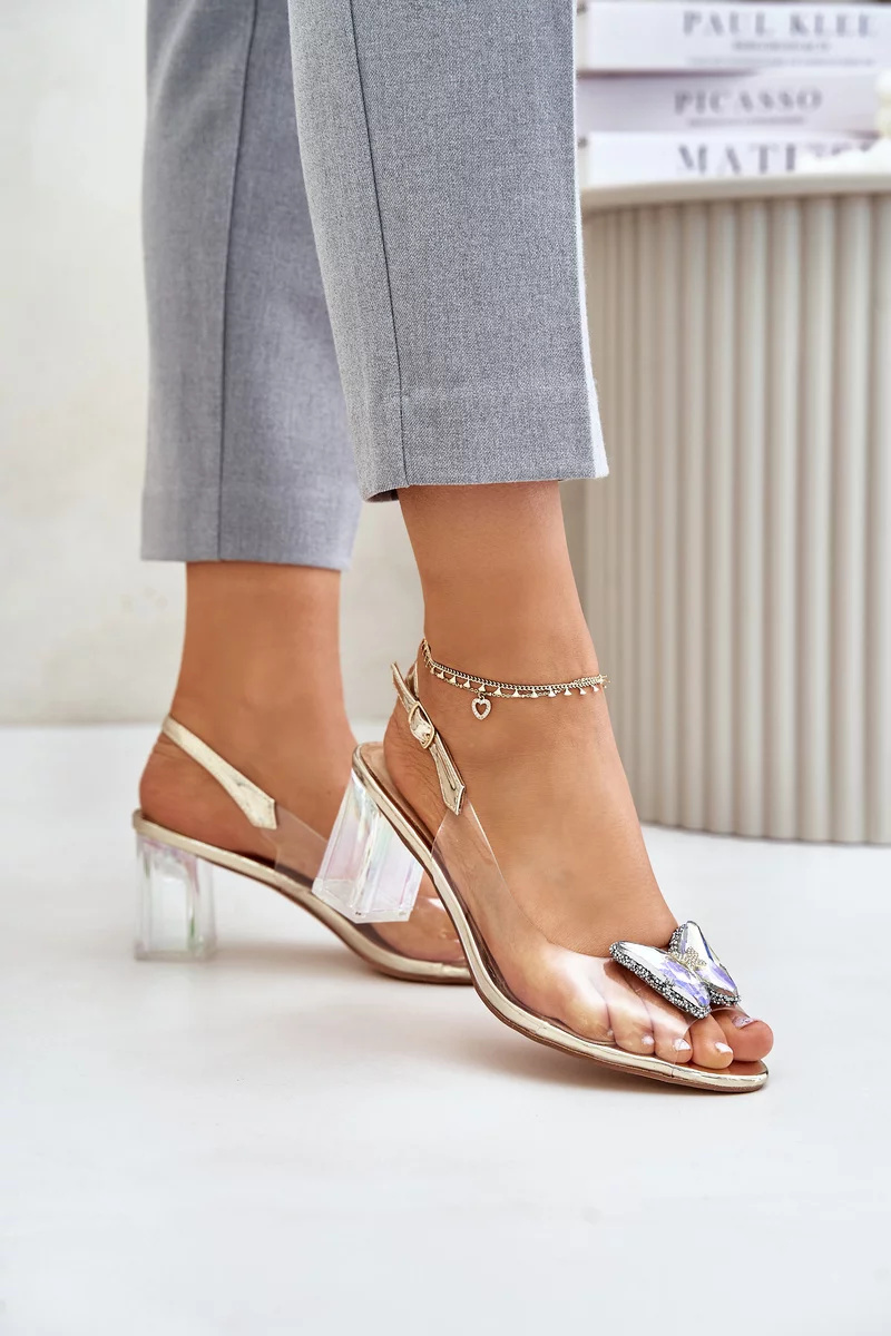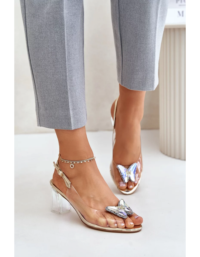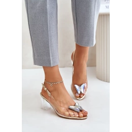 Dámské sandály s průhledným svrškem. Osazené na podpatku ve tvaru sloupku. Vpředu ozdoba ve tvaru motýla, která dodává výjimečný půvab. Zapínání na nastavitelný pásek s přezkou. Měkká vložka je vyrobena z přírodní kůže. Ideální na různé oslavy. Při výběru velikosti se prosím řiďte tabulkou velikostí.