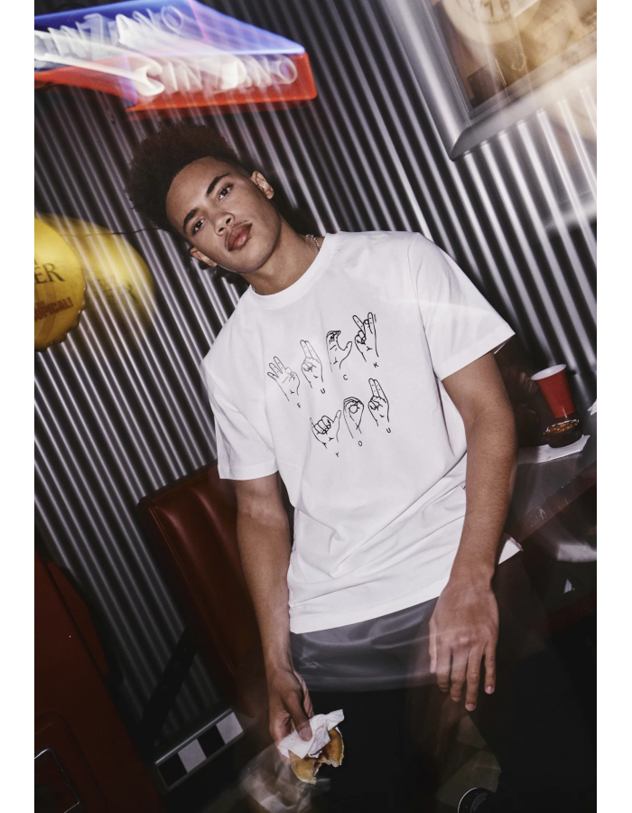 Vždy jste se chtěli naučit znakový jazyk? Skvělé, začněte tím, že se naučíte vyjadřovat jeho pravděpodobně dvě nejdůležitější slova. Na přední straně košile jsou vyobrazeny nezbytné znaky rukou a bouchnutím bourají veškeré komunikační stěny. Klasické tričko na pondělí!