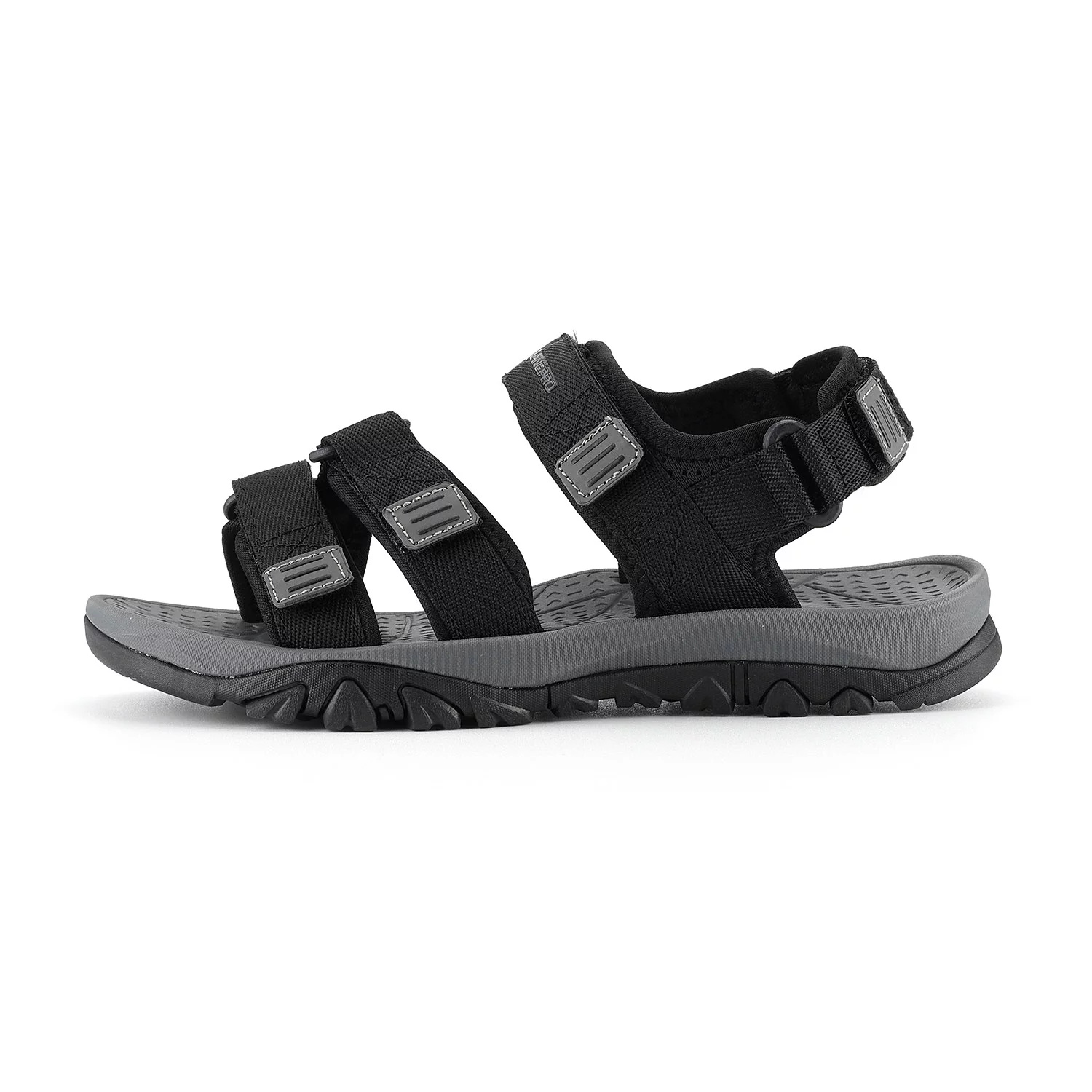 Unisex letní sandály GODE kombinují pevný syntetický svršek s pohodlnou EVA stélkou a pružnou pryžovou podešví, která se snadno přizpůsobí každému kroku. Měkká mezipodešev zajišťuje maximální komfort i při delším nošení. Díky třem nastavitelným páskům na suchý zip je noha bezpečně a pohodlně fixována. Elegantní tmavý vzhled, decentní ozdobné prošití a moderní potisk dodávají sandálům stylový, ale zároveň nenápadný charakter.