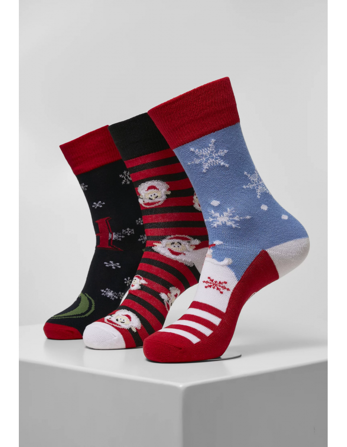 Sada ponožek tři v jednom po lýtka s různými vánočními motivy, jako jsou sněhové vločky, hlavy Santa a slovo "Ho". Šikovná sada ponožek je vyrobena z bavlny, polyesteru a elastanu a je k dispozici ve čtyřech různých velikostech. Elastické manžety poskytují dodatečné pohodlí.