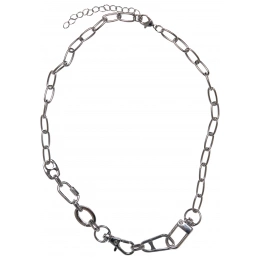 Tento náhrdelník ve tvaru kotevního řetízku a s řadou různých karabin, které se k sobě zaháknou, působí drsným dojmem. Doplněk je vyroben ze železa a slitiny zinku a je dlouhý 47 cm. Nabízí středně vysoký sed na krku a lze jej dále upravit pomocí 7cm prodlužovacího řetízku.