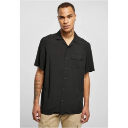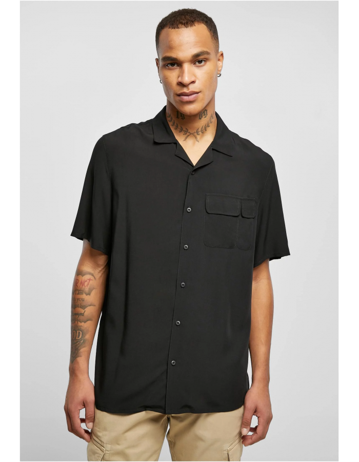 Pánská košile je vybavena klopovým límcem a dvěma různě velkými náprsními kapsami s klopami, které sedí vedle sebe. Styl dotváří knoflíková léga, ramenní sedlo a krátké rukávy. Pánská košile je ušita z lehké tkaniny z viskózy a má regular fit.
