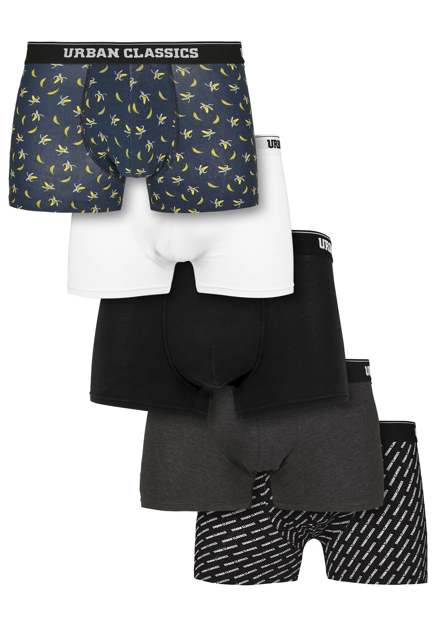 Praktické pět v jednom balení obsahuje pět stylových boxerek Urban Classics.Pánské spodní prádlo je vyzkoušeného a testovaného slim střihu a nabízí elastický pas s nepřetržitým logem Urban Classics. Pánské boxerky jsou vyrobeny z bavlněné tkaniny šetrné k pokožce s podílem elastanu a zaručují maximální pohodlí při nošení.