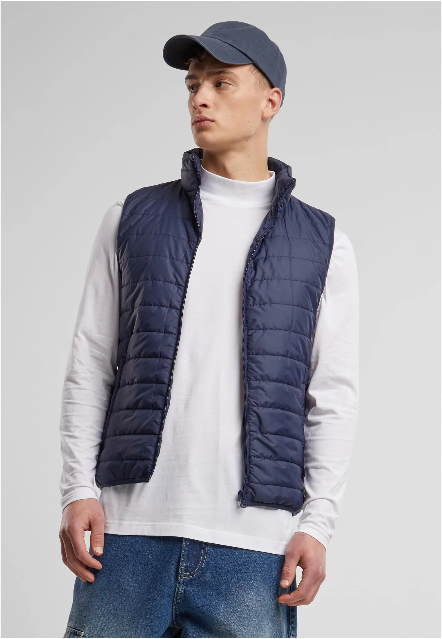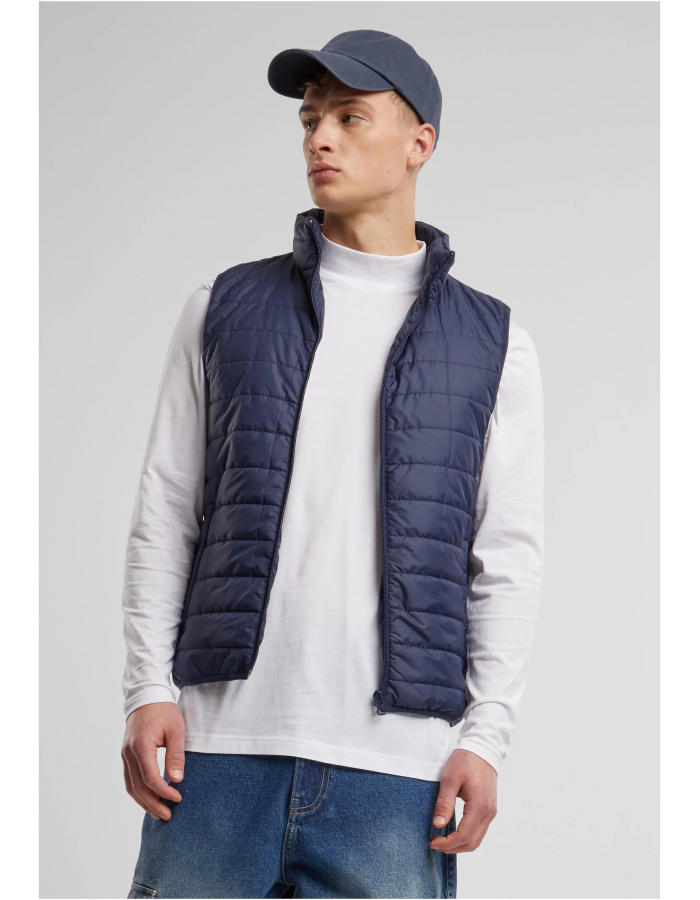 Tmavě modrá prošívaná vesta na zip, která je lehká a ideální na přechodné období. Má stojáček pro lepší ochranu krku a sportovně-ležérní styl. Kombinace s bílým dlouhým tričkem a džínami vytváří jednoduchý, ale stylový outfit. Vesta se hodí na volnočasové aktivity, když je venku chladněji, ale stále příliš teplo na bundu.