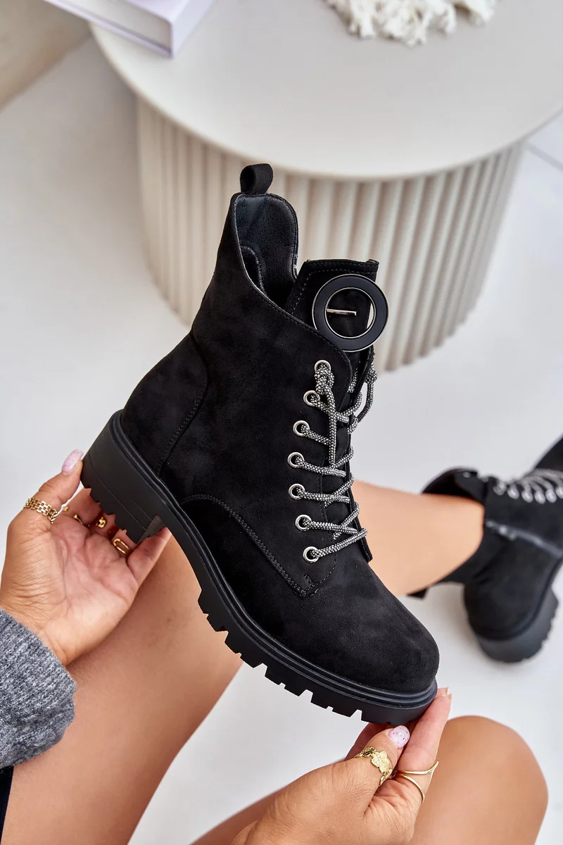 Dámské kotníkové boty z eko semiše jsou kombinací stylu a pohodlí, ideální na chladnější dny. Model je zateplený, což zajišťuje teplo, a zapínání na zip usnadňuje rychlé oblékání. Ozdobné šněrování dodává jedinečný charakter a plochý podpatek zaručuje pohodlí při nošení po celý den. Ozdoba na jazyku představuje jemný akcent, který zdůrazňuje jejich módní design. Ideální pro každodenní stylizace. Při výběru velikosti se prosím řiďte tabulkou velikostí.