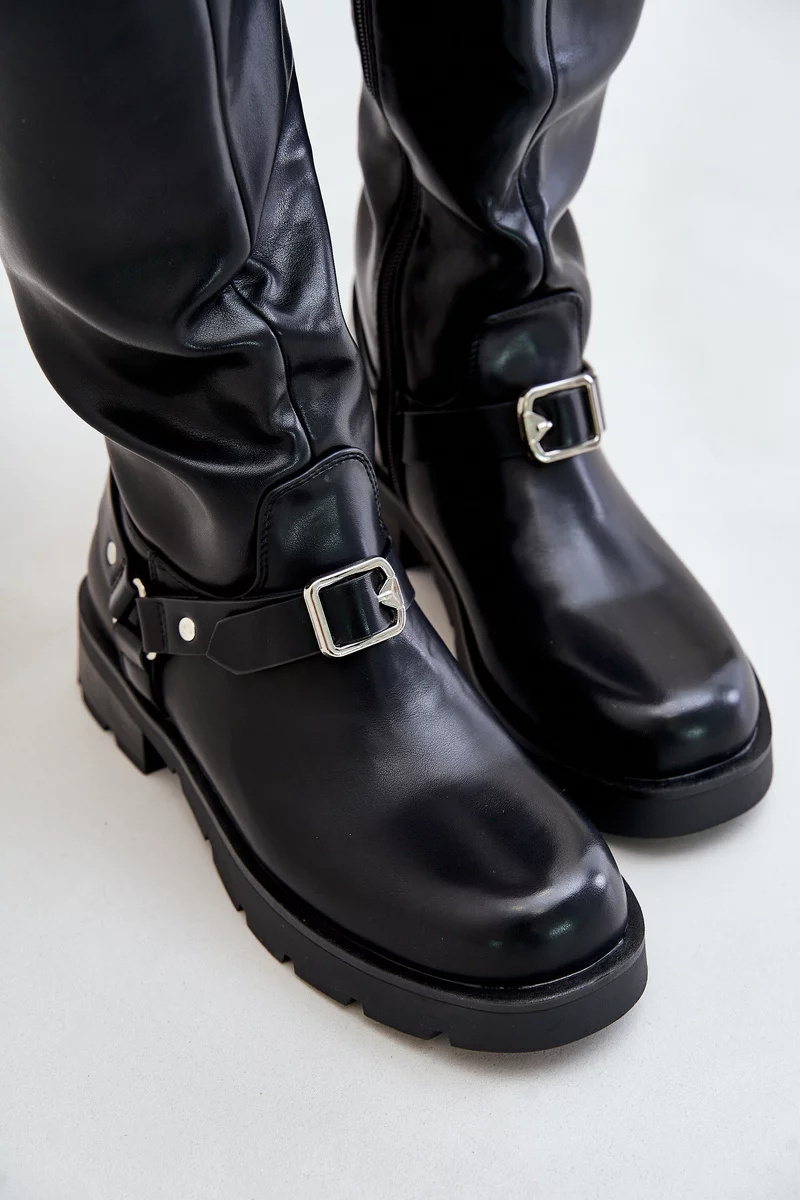 Dámské kozačky byly vyrobeny z vysoce kvalitní eko kůže. Mají zateplení obuvnickou dekou. Osazené na plochém podpatku. Model zapínaný na zámek. Zaoblené špičky. Svršek nad koleno ozdobený pásky s přezkou. Tento klasický střih by neměl chybět ve tvém šatníku! Při výběru velikosti se prosím řiďte tabulkou velikostí.