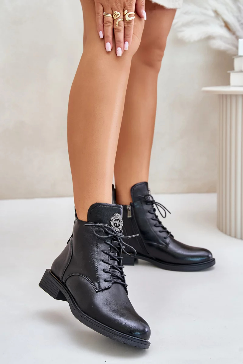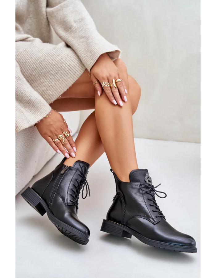 Zabudované na plochém podpatku zajišťují pohodlí při nošení po celý den. Model má jak šněrování, tak zip, což usnadňuje přizpůsobení a rychlé obouvání. Vnitřek zateplený obuvnickou dekou zaručuje teplo. Detail umístěný na jazyku dodává originální charakter. Ideální pro každodenní, ležérní stylizace. Při výběru velikosti se prosím řiďte tabulkou velikostí.